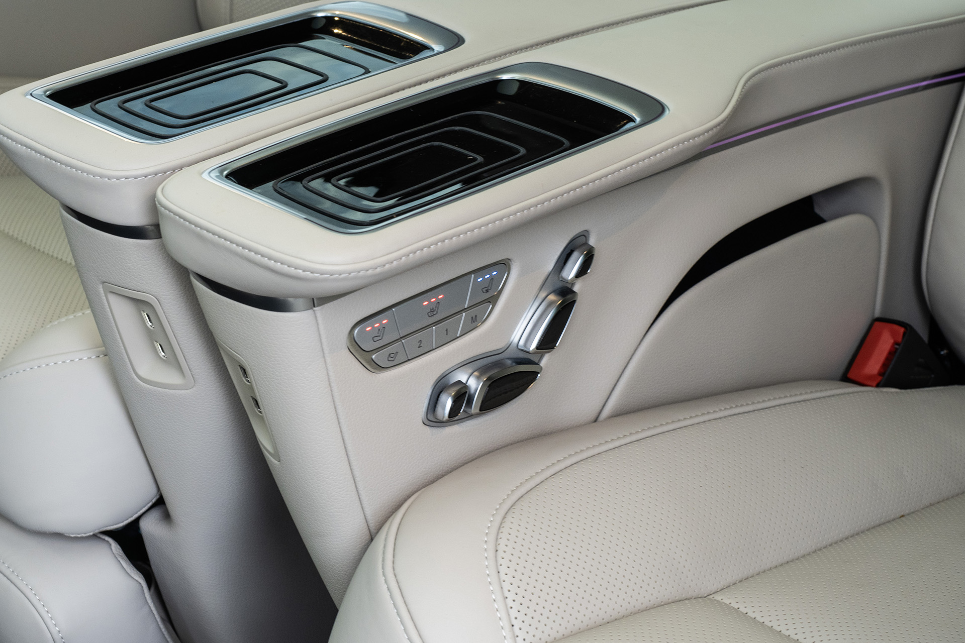 Zvonka môže Mercedes V300d vyzerať nenápadne, ale vnútri môže predviesť absolútny opak. Môže predviesť to, čím sa donedávna pýši len mája Bach. Áno, tieto Špeciálne sedadlá za viac ako 8 000 € už v ponuke boli aj pred modernizáciou, ale stále dokážu zaujať. Usporiadanie 2 sedačky vpredu, 2 v strede a 2 vzadu sa dá presúvať, čiže variabilita je dostatočná. My sme mali 2 extrémne luxusné sedadlá úplne vzadu, čo zväčšovalo priestor na nohy a umožňovalo spraviť z auta akúsi kanceláriu so stredným radom otočeným proti smeru jazdy.