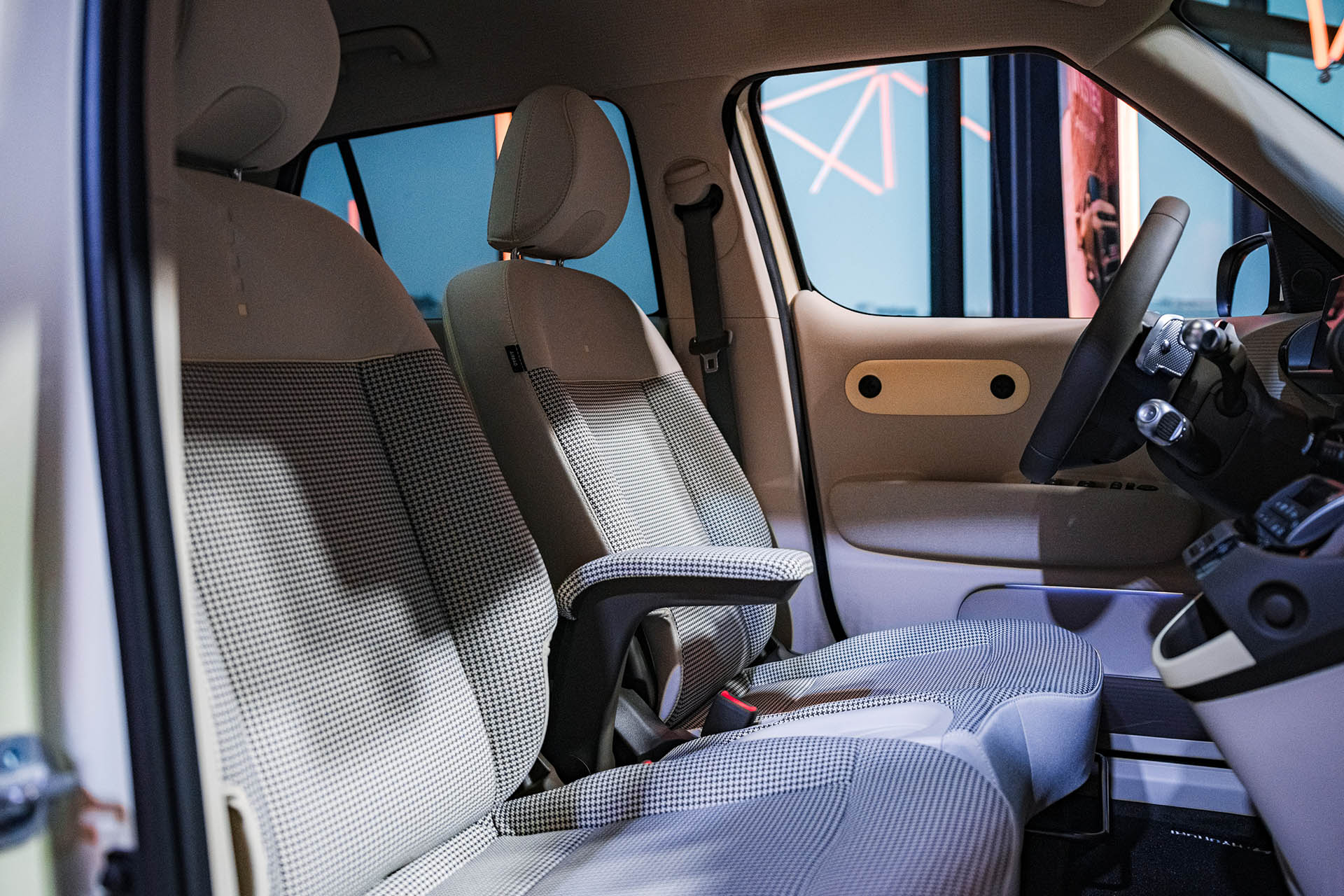 Prístrojová doska predvádza dva displeje, každý s uhlopriečkou 10,25 palca. Jeden je pred vodičom a druhý je pred spolujazdcom. Pod volantom je elektronický ovládač prevodovky, podobne ako sme zvyknutí z modelov Ioniq. Práve toto prevedenie umožňuje použiť prednú lavicu. No a na dverách a prístrojovej doske sú aj odkladacie priečinky a háčiky na rôzne veci. Najdôležitejšie ale bude, že tá zadná lavica je posuvná. Dokonca aj pri posunutí vpred sa dozadu zmestí dospelý človek, ale nebude mať komfort.