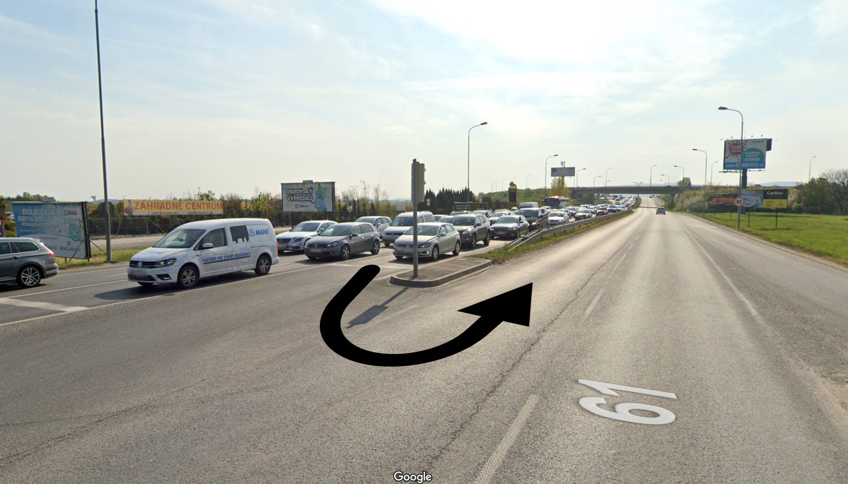 Vyvstáva otázka, či sa môžete otočiť na takejto klasickej križovatke, v našom prípade ide o križovatku ulice Pri mlyne a cesty č. 61 Cesta na Senec v Bratislave: